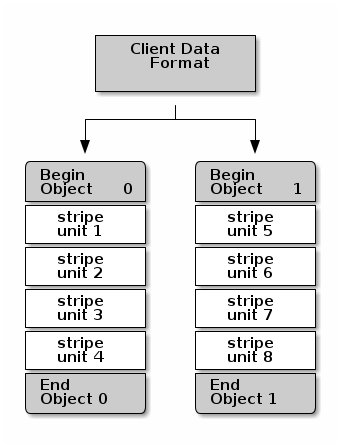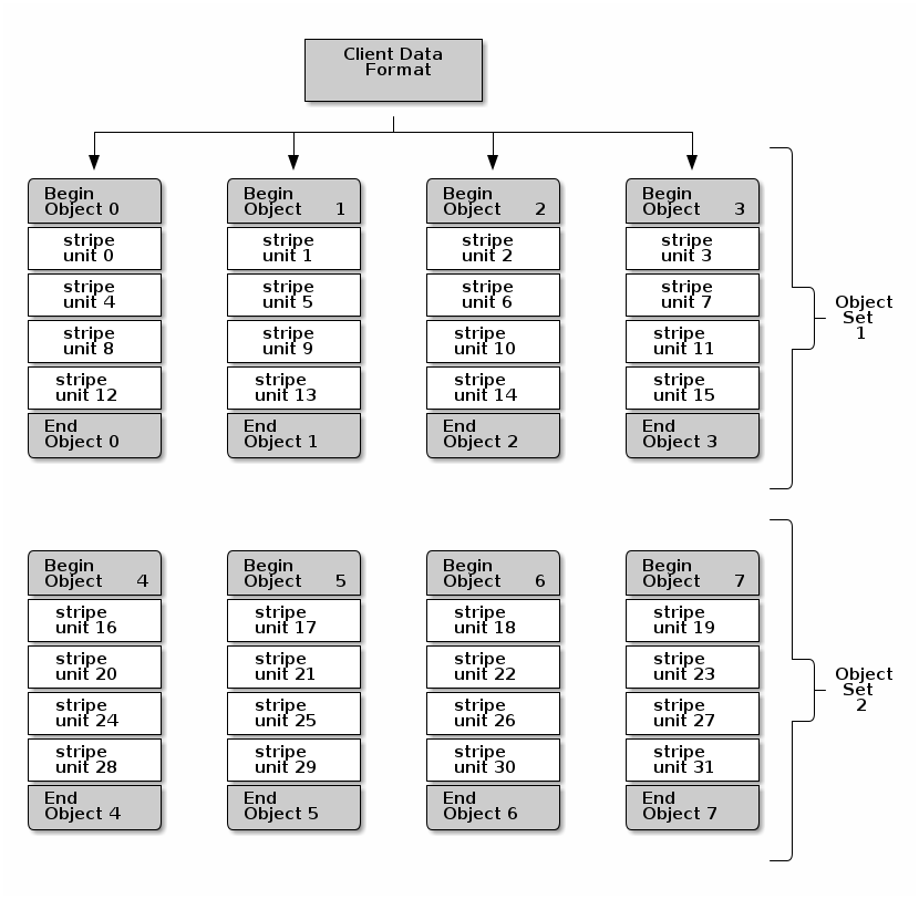 • Stripe Count: The Ceph Client writes a sequence of stripe units over a series of objects determined by the stripe count. The series of objects is called an object set. After the Ceph Client writes to the last object in the object set, it returns to the first object in the object set.