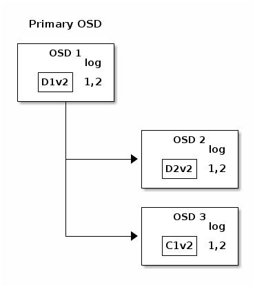OSD 1 is the primary and receives a WRITE FULL from a client, which means the payload is to replace the object entirely instead of overwriting a portion of it. Version 2 (v2) of the object is created to override version 1 (v1). OSD 1 encodes the payload into three chunks: D1v2 (i.e. Data chunk number 1 version 2) will be on OSD 1, D2v2 on OSD 2 and C1v2 (i.e. Coding chunk number 1 version 2) on OSD 3. Each chunk is sent to the target OSD, including the primary OSD which is responsible for storing chunks in addition to handling write operations and maintaining an authoritative version of the placement group logs. When an OSD receives the message instructing it to write the chunk, it also creates a new entry in the placement group logs to reflect the change. For instance, as soon as OSD 3 stores C1v2, it adds the entry 1,2 ( i.e. epoch 1, version 2 ) to its logs. Because the OSDs work asynchronously, some chunks may still be in flight ( such as D2v2 ) while others are acknowledged and persisted to storage drives (such as C1v1 and D1v1).