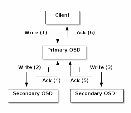 After identifying the target placement group, the client writes the object to the identified placement group’s primary OSD. The primary OSD then consults its own copy of the CRUSH map to identify secondary OSDS, replicates the object to the placement groups in those secondary OSDs, confirms that the object was stored successfully in the secondary OSDs, and reports to the client that the object was stored successfully. We call these replication operations subops.