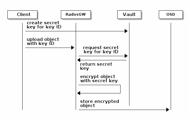 The Object Gateway will fetch the key from Vault, encrypt the object and store it in the bucket. Any request to download the object will make the Object Gateway automatically retrieve the correspondent key from Vault and decrypt the object.